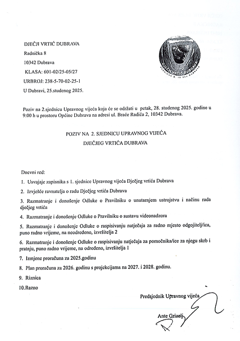 POZIV NA 2. SJEDNICU UPRAVNOG VIJEĆA DJEČJEG VRTIĆA DUBRAVA 2025. GOD.